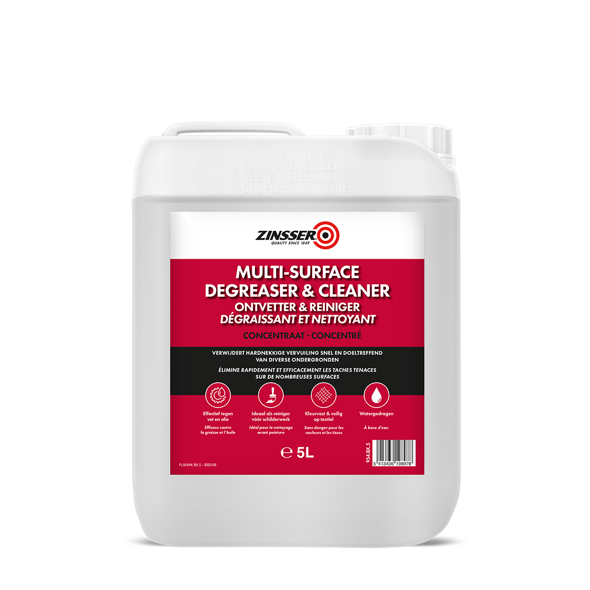 ZINSSER® MULTI-SURFACE DEGREASER & CLEANER is a water-based detergent that is colour fast, fabric safe and removes tough stains effectively from many surfaces. Perfect for preparing surfaces before painting.Perfect for preparing surfaces before painting, also great for removing dried water-based paint, paint overspray, tape residue, glue and adhesive, wax, food & drink stains, bird droppings, smoke damage, tree sap, grease & oil, marker & crayon, pet stains, brake dust, fireplace soot, oxidation, lipstick, scuff marks, blood stains, sun tan oil, tar, chewing gum, soap scum, shoe polish, & more. SUITABLE SURFACES: Windows, floors, doors, framework, tiles, sinks, showers, tools & equipment, machinery, BBQs & ovens.